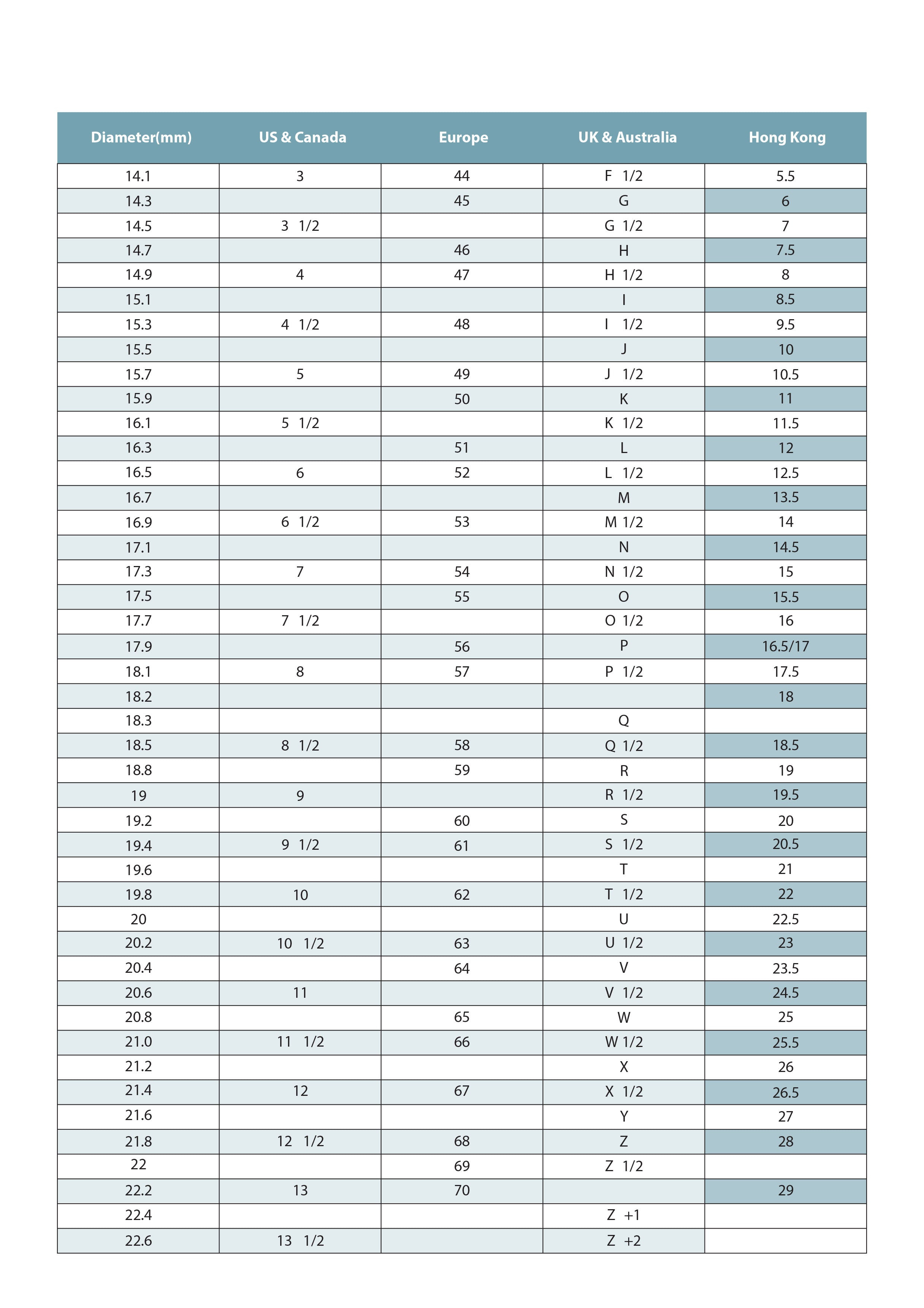 Step 2: Refer to the table below to find your size according to the measured diameter.