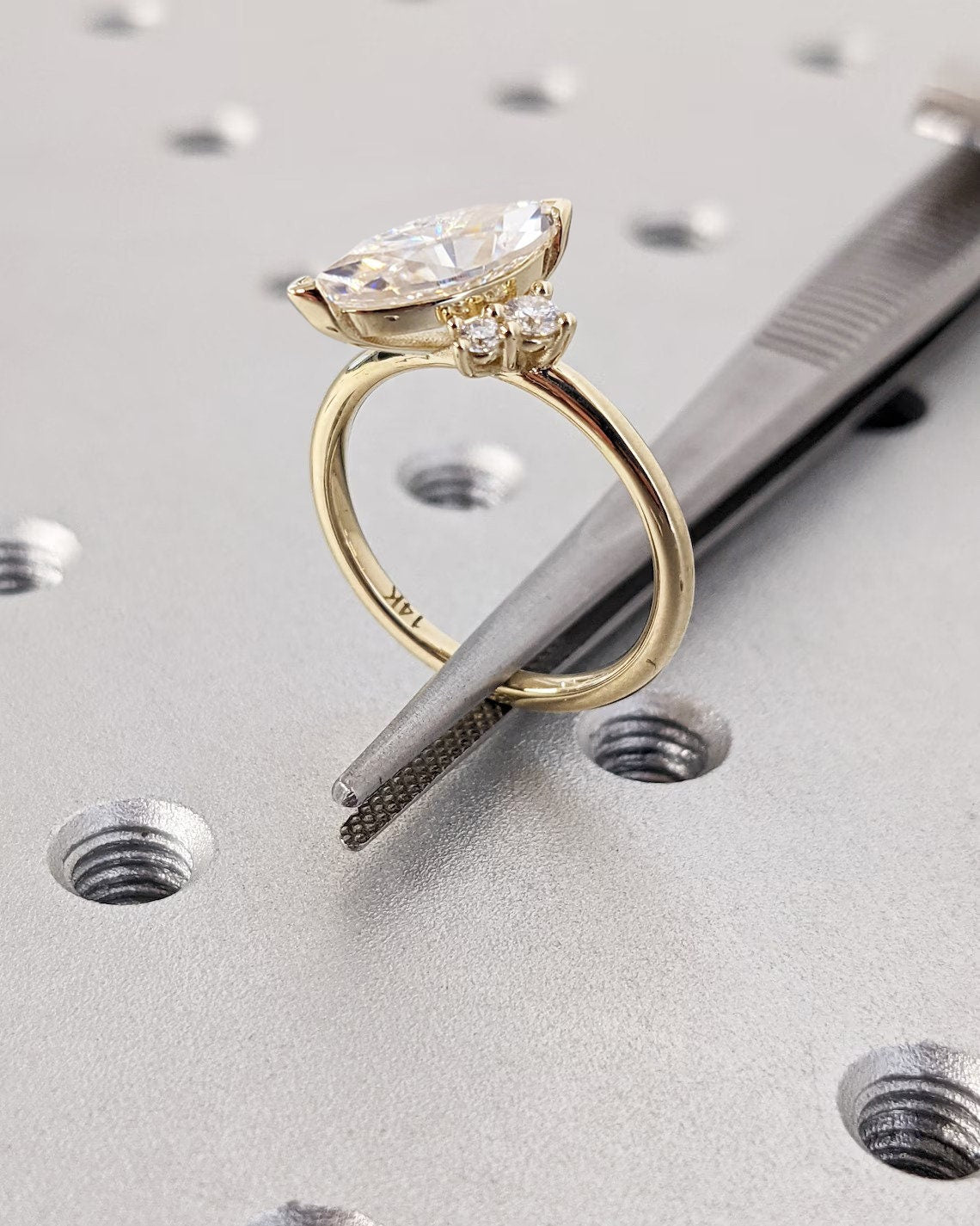 ✥ This 1.0CT Asymmetrical Marquise Cut Cluster Lab Grown Diamond Engagement Ring for women features a striking design with marquise cut diamonds arranged in an asymmetrical cluster. The unique arrangement offers a modern twist on classic elegance, creating a dazzling effect that captures attention. Perfect for those who appreciate bold and innovative styles, this ring is available in various sizes. We also offer 1.50CT and 2.0CT options. Contact us if you need any size to find the perfect fit for your special moment.