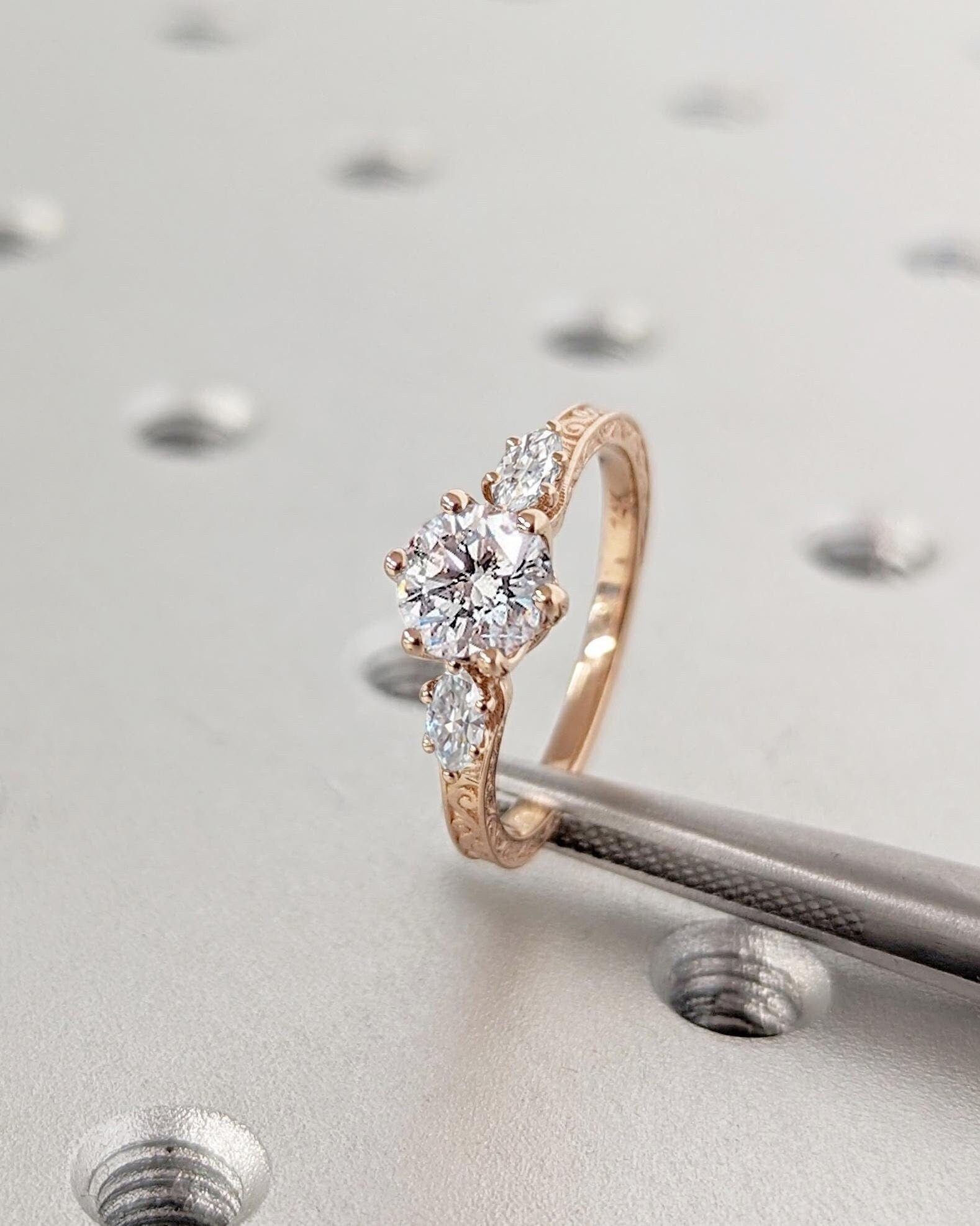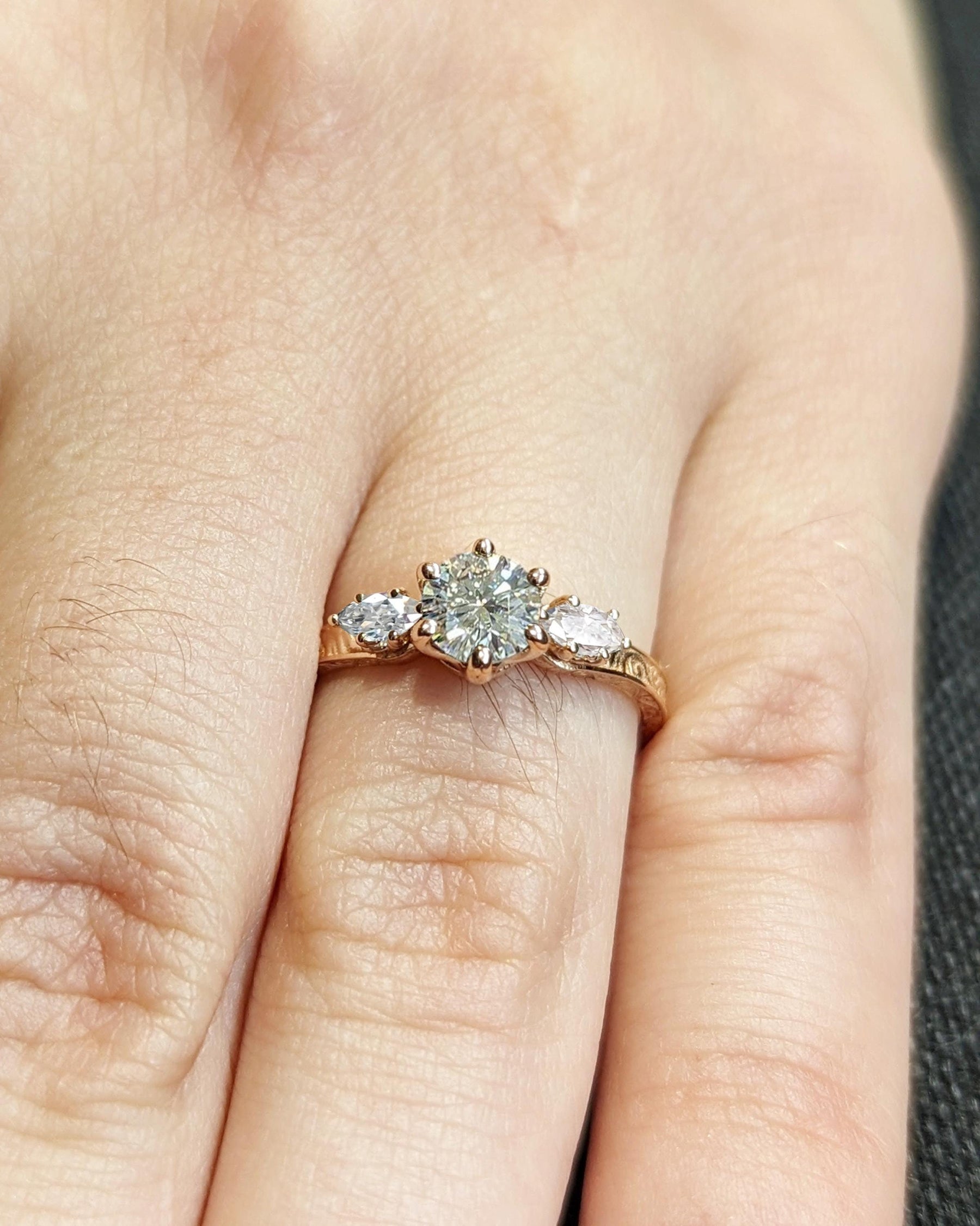 ✥ This 1.0CT Round Brilliant Cut Three Stone Lab Grown Diamond Engagement Ring features a trio of sparkling diamonds set on an ornate scrollwork band. The round brilliant cut stones provide exceptional brilliance, while the intricate band design adds a touch of vintage elegance. Perfect for those who appreciate classic beauty with a unique twist, this ring is an ideal choice for marking a special occasion. Available in various sizes to ensure a perfect fit for your memorable moment.