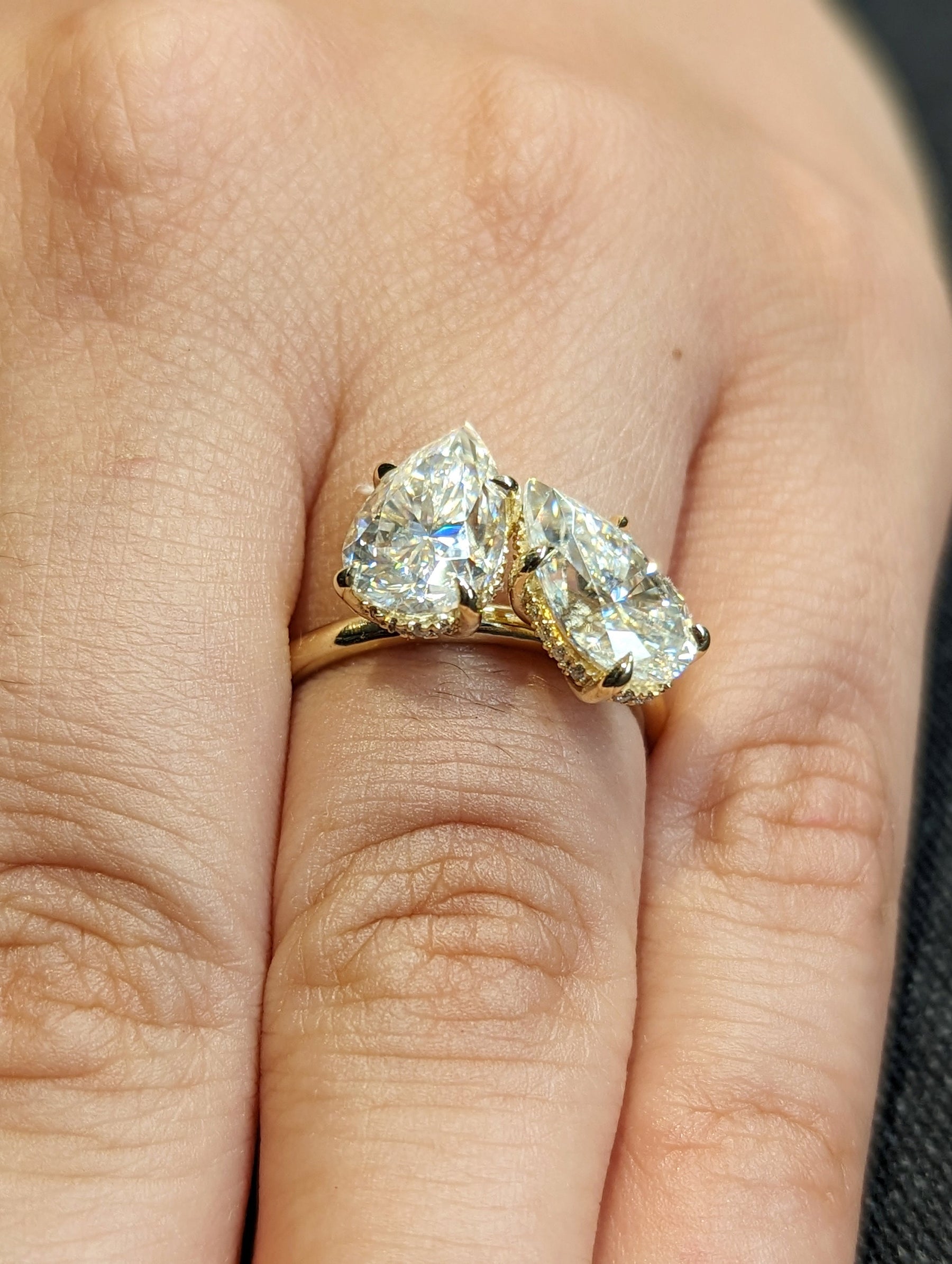 ✥ Presenting the exquisite 2.50CT Pear Hidden Halo Lab Grown Two Stone Diamond Engagement Ring, a breathtaking choice for those who cherish unique beauty and modern romance. This stunning ring features two elegantly shaped pear lab-grown diamonds, symbolizing the bond between two souls, set side by side to create a captivating and balanced look. The brilliance of the diamonds is enhanced by a delicate band, making it a perfect statement piece for any engagement or special occasion. We have options of 3.0ct & 3.50ct available, and if you need any carat sizes, please contact us for personalized assistance. Celebrate your love with this enchanting ring that beautifully represents your journey together.