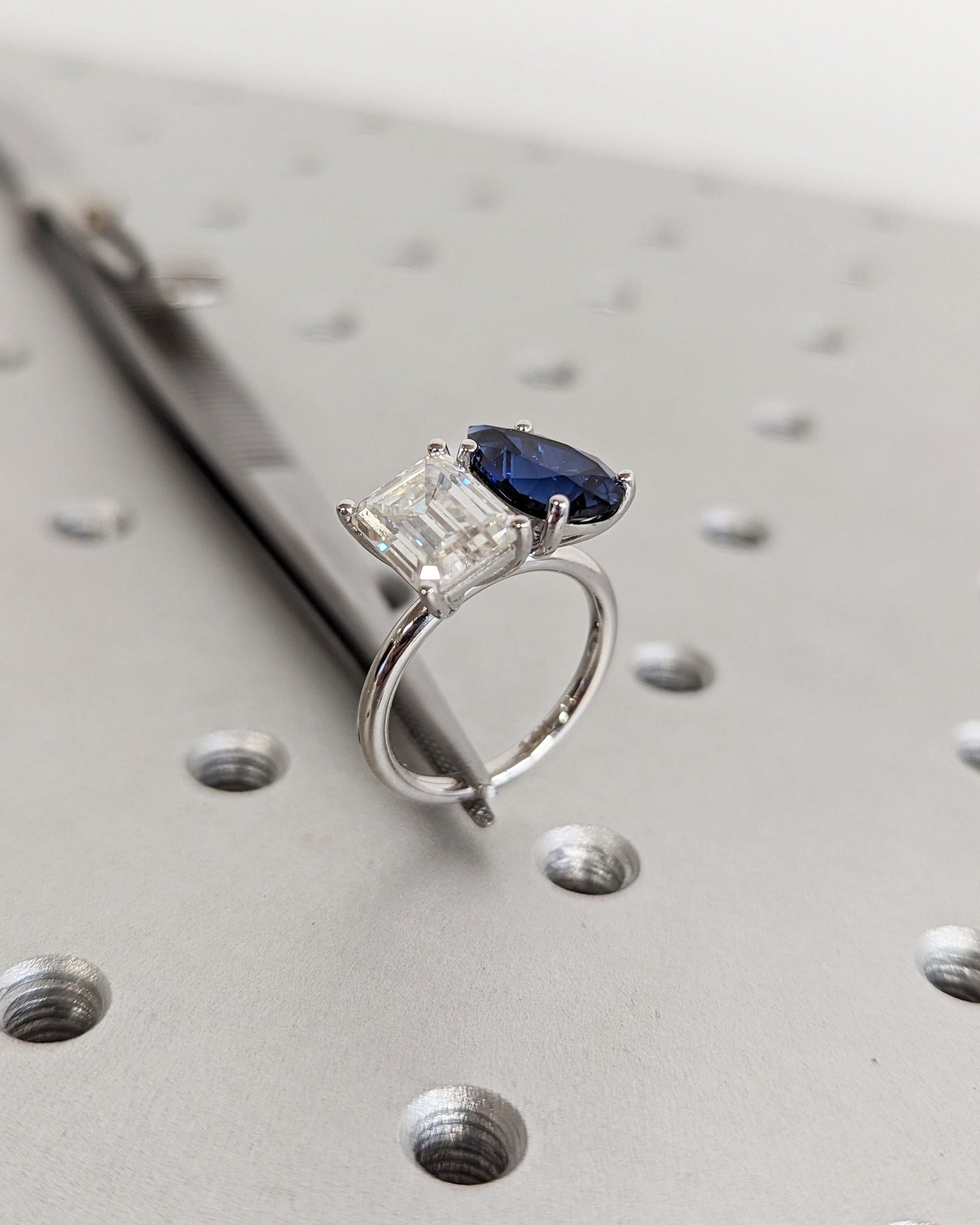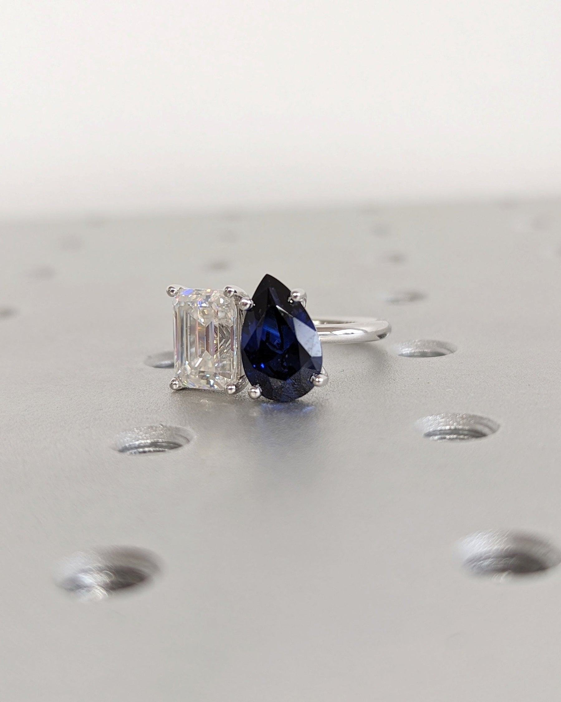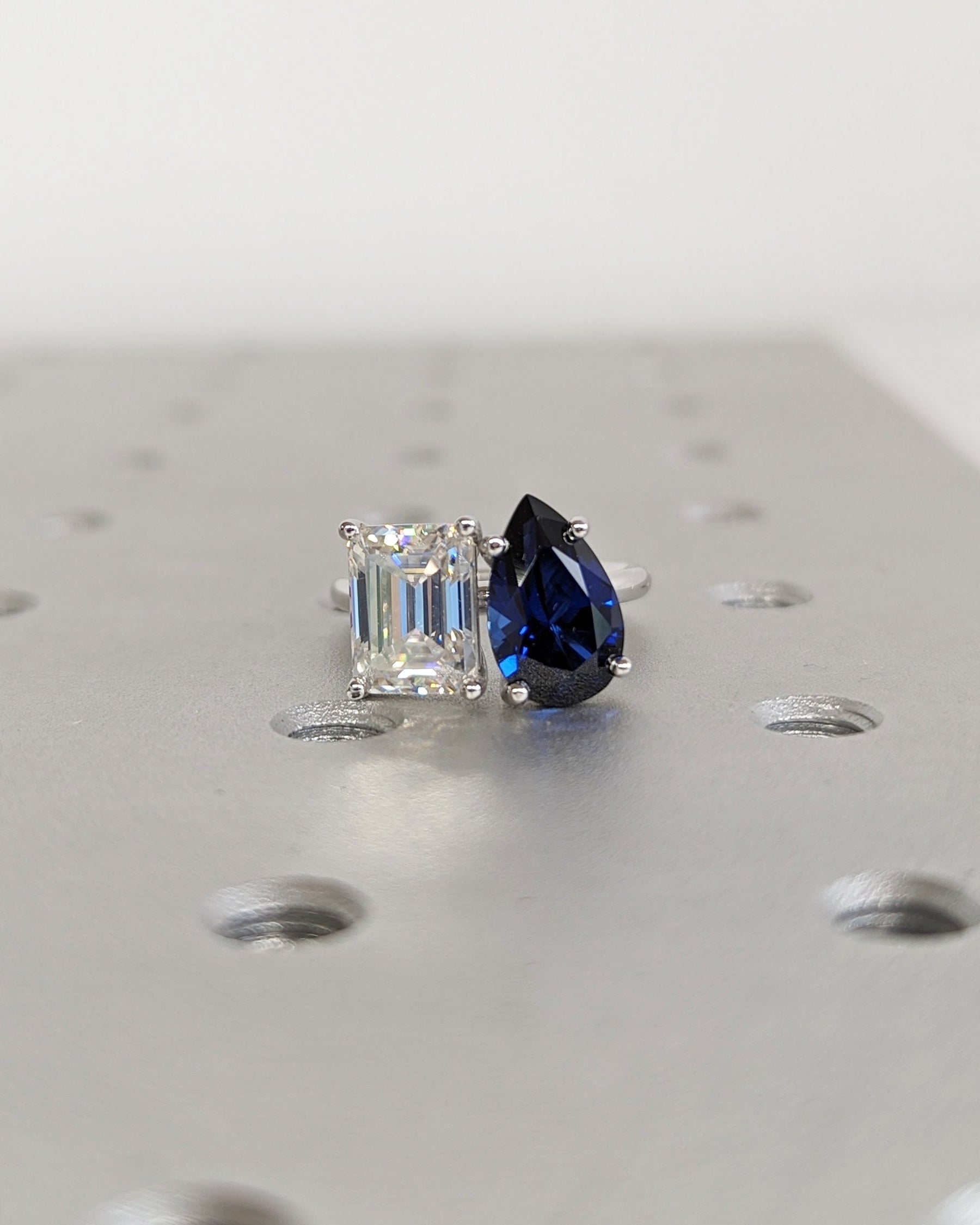2.50CT Trellis Double Stone Engagement Ring Pear Cut Blue Sapphire & Emerald Cut Lab Diamond Two Stone Engagement Ring