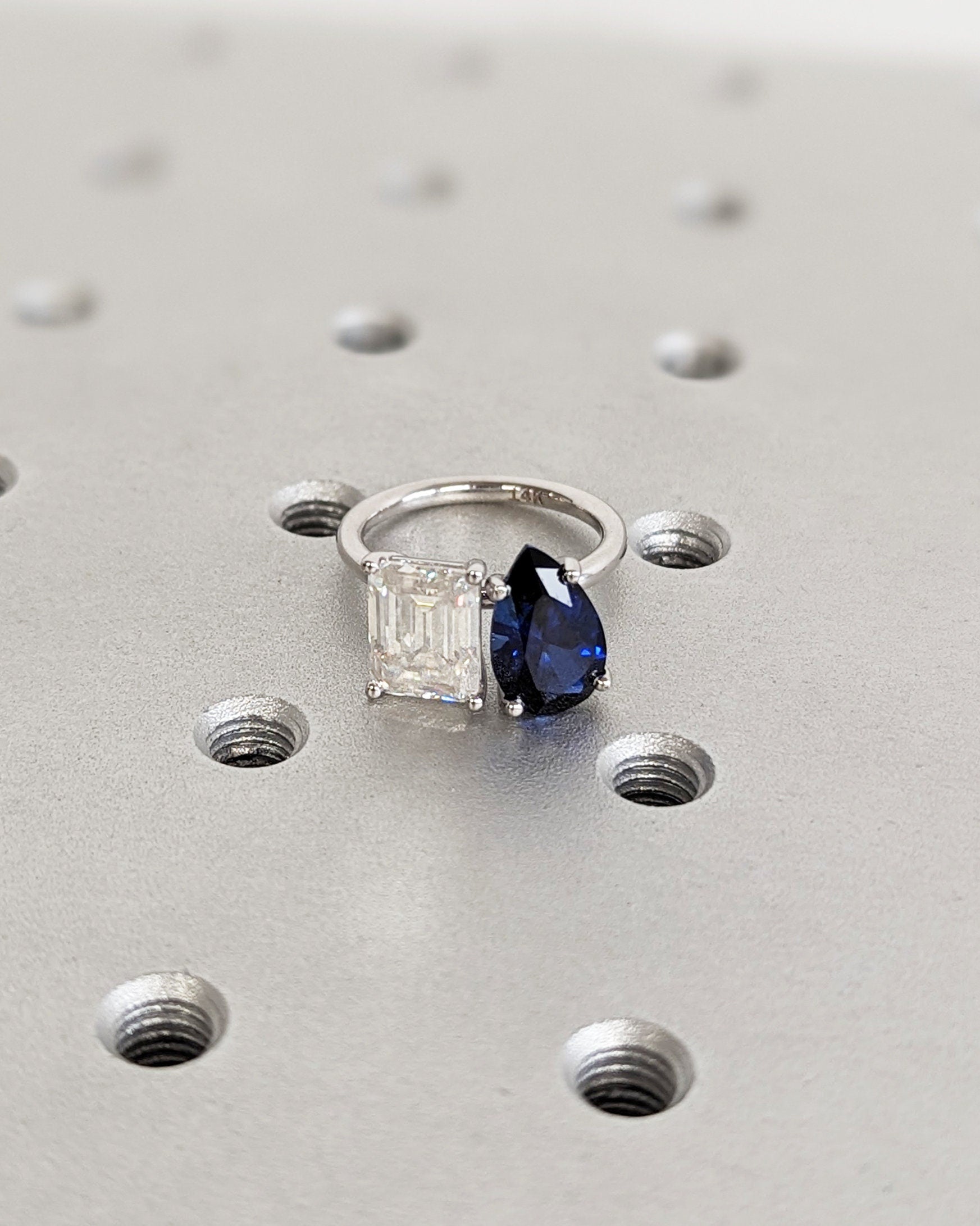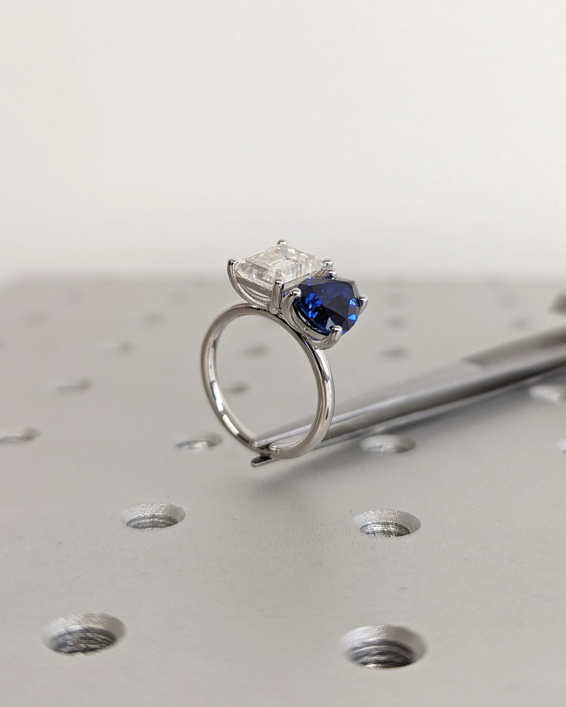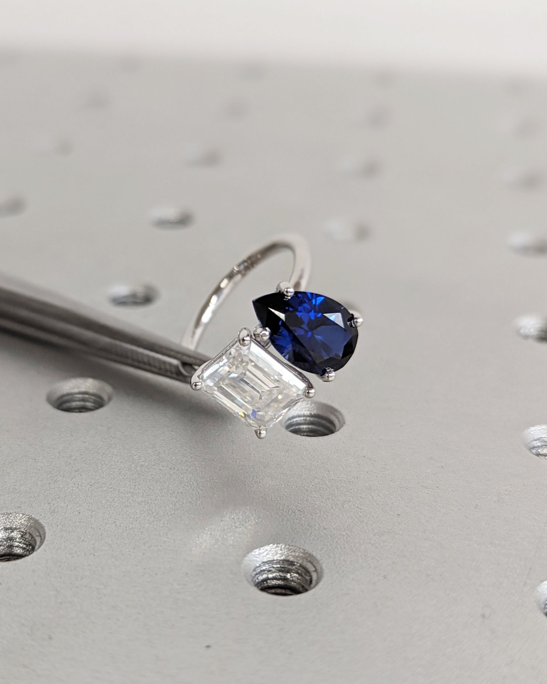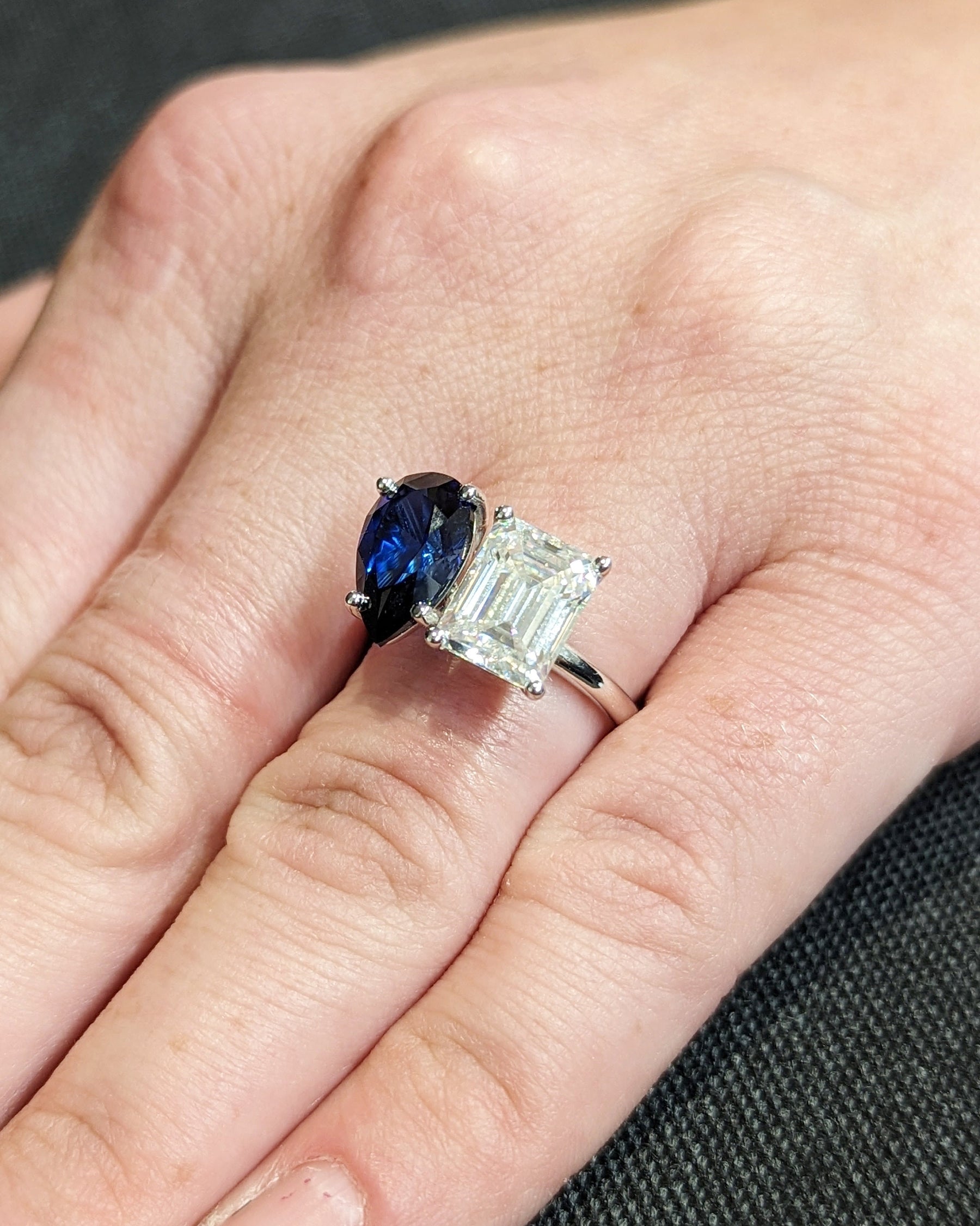 2.50CT Trellis Double Stone Engagement Ring Pear Cut Blue Sapphire & Emerald Cut Lab Diamond Two Stone Engagement Ring