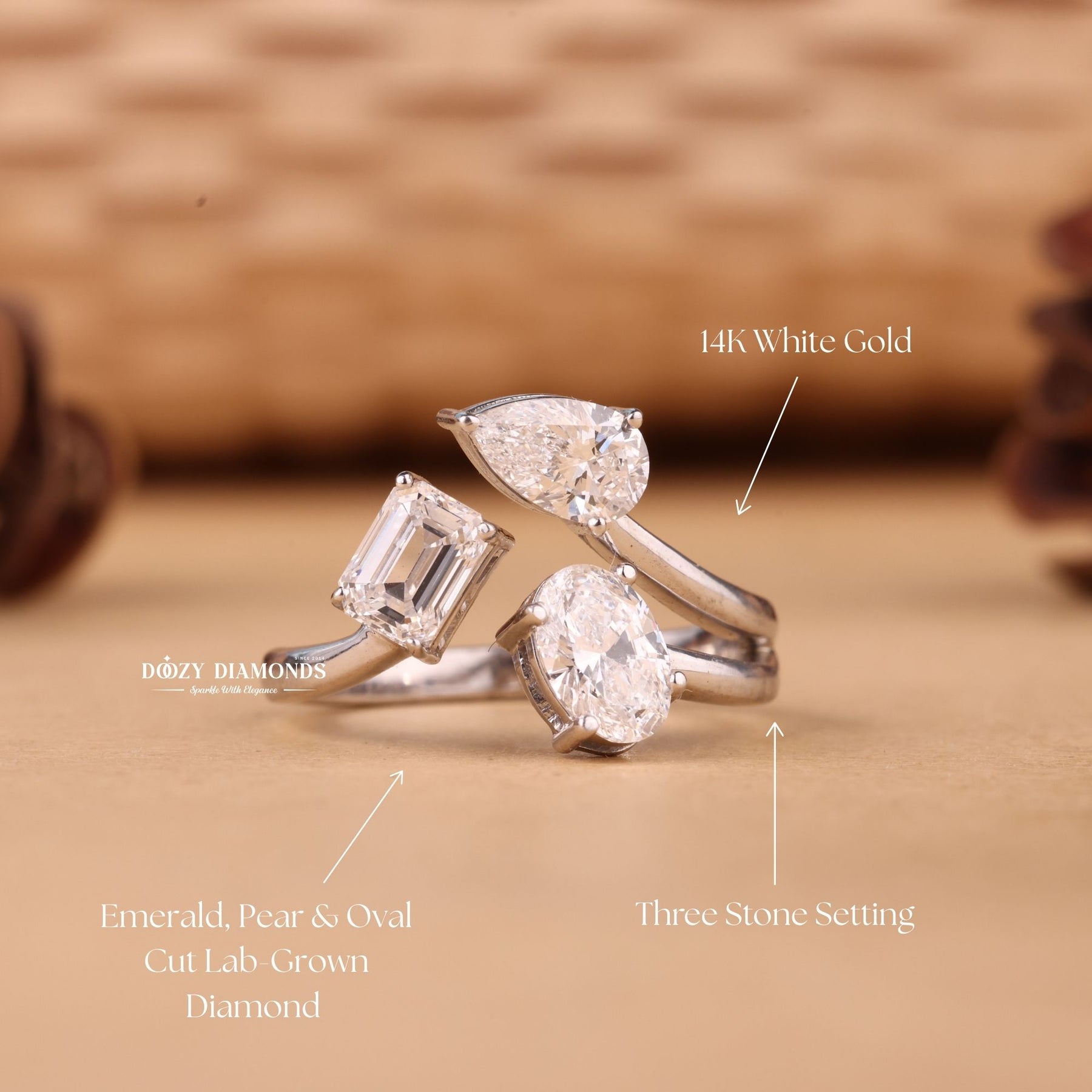 Oval, Pear & Emerald Cut F/VS2 Lab Grown Diamond Three Stone Engagement Ring