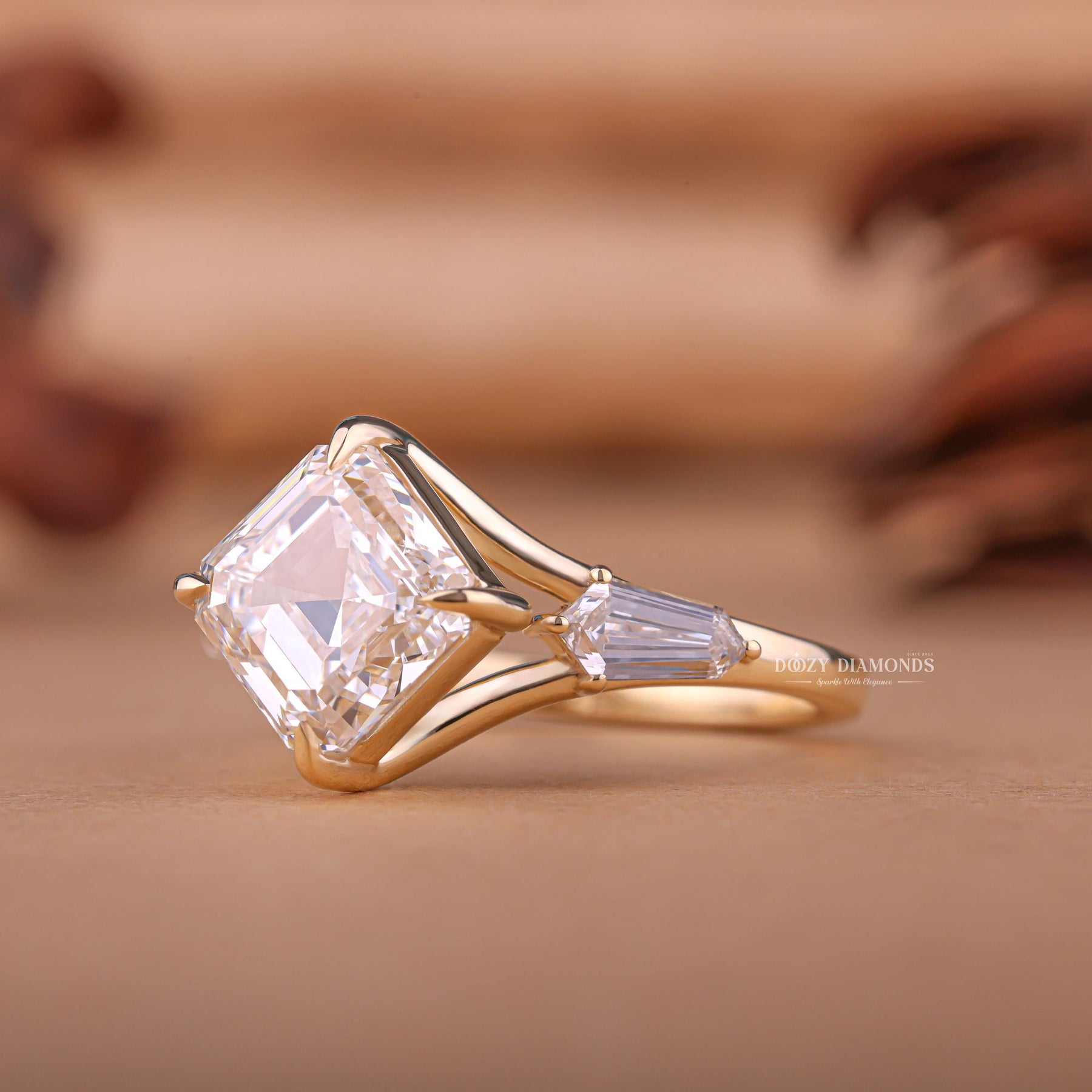 ✥ The Three Stone Style Engagement Ring Shown in the Picture a Beautiful 2.0ct Asscher Cut E-Color, VS2-Clarity CVD Lab Grown Diamond.